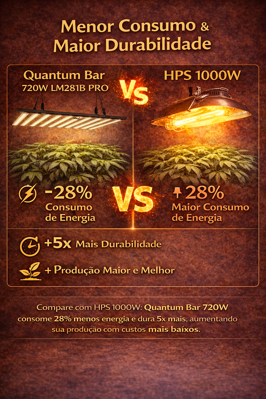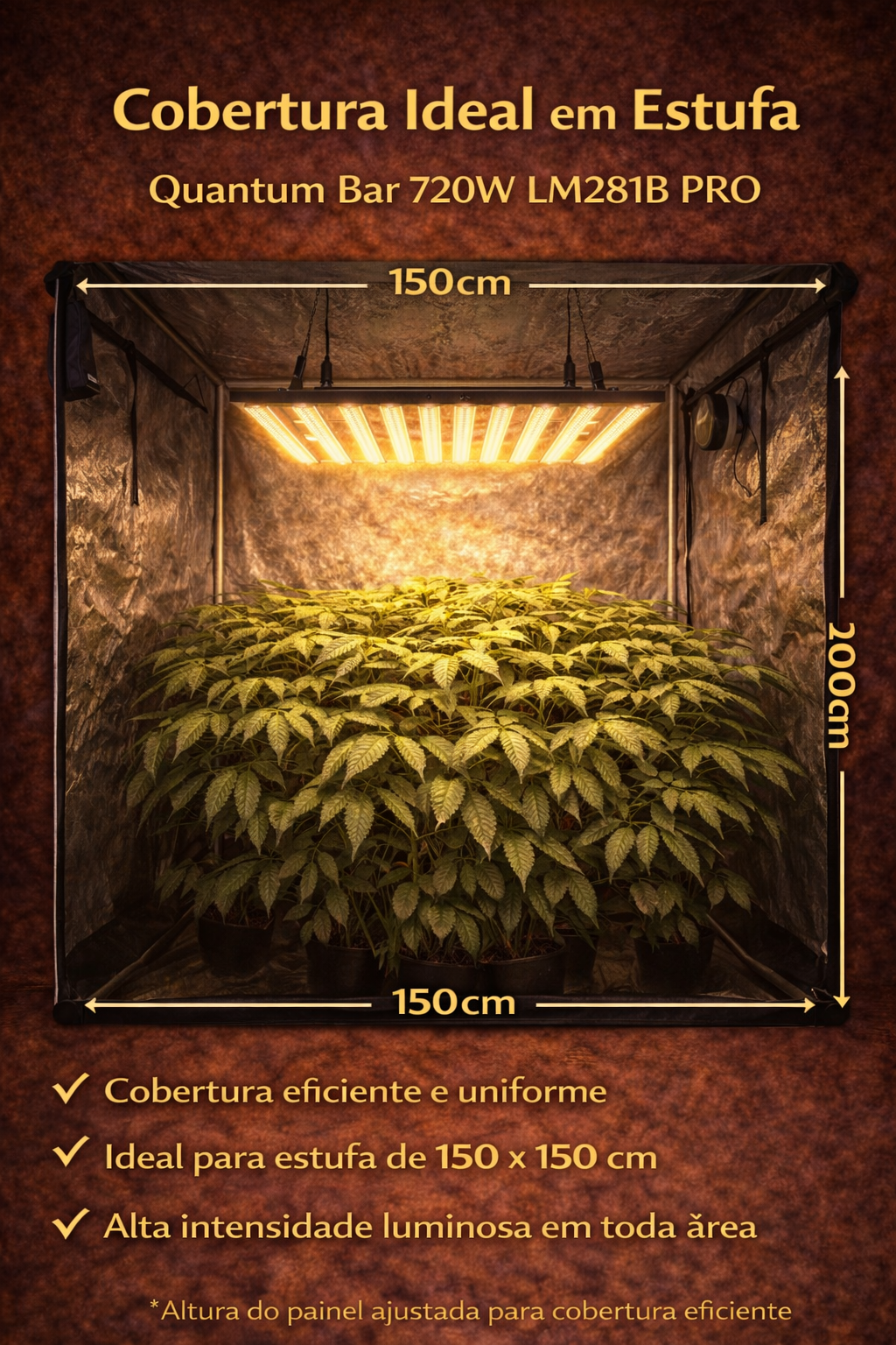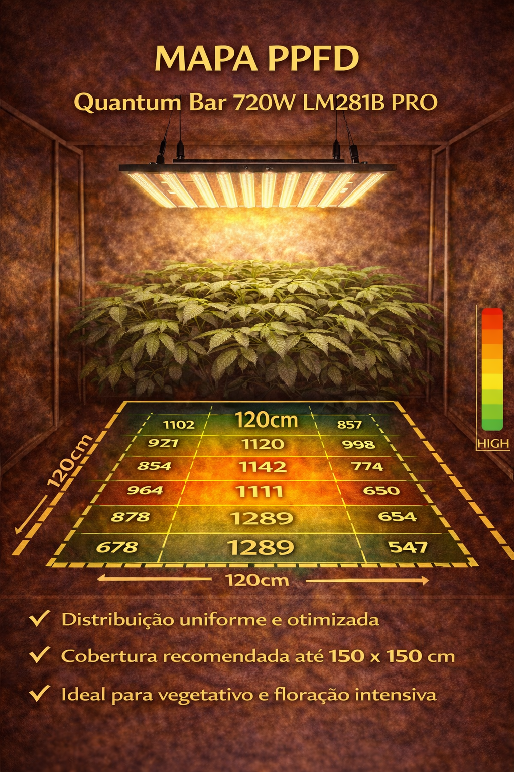 💡 Com o Quantum Bar 720W LM281B PRO você entrega às plantas a intensidade luminosa necessária para alcançar o máximo potencial genético, resultando em plantas mais vigorosas, flores mais densas e colheitas maiores.
